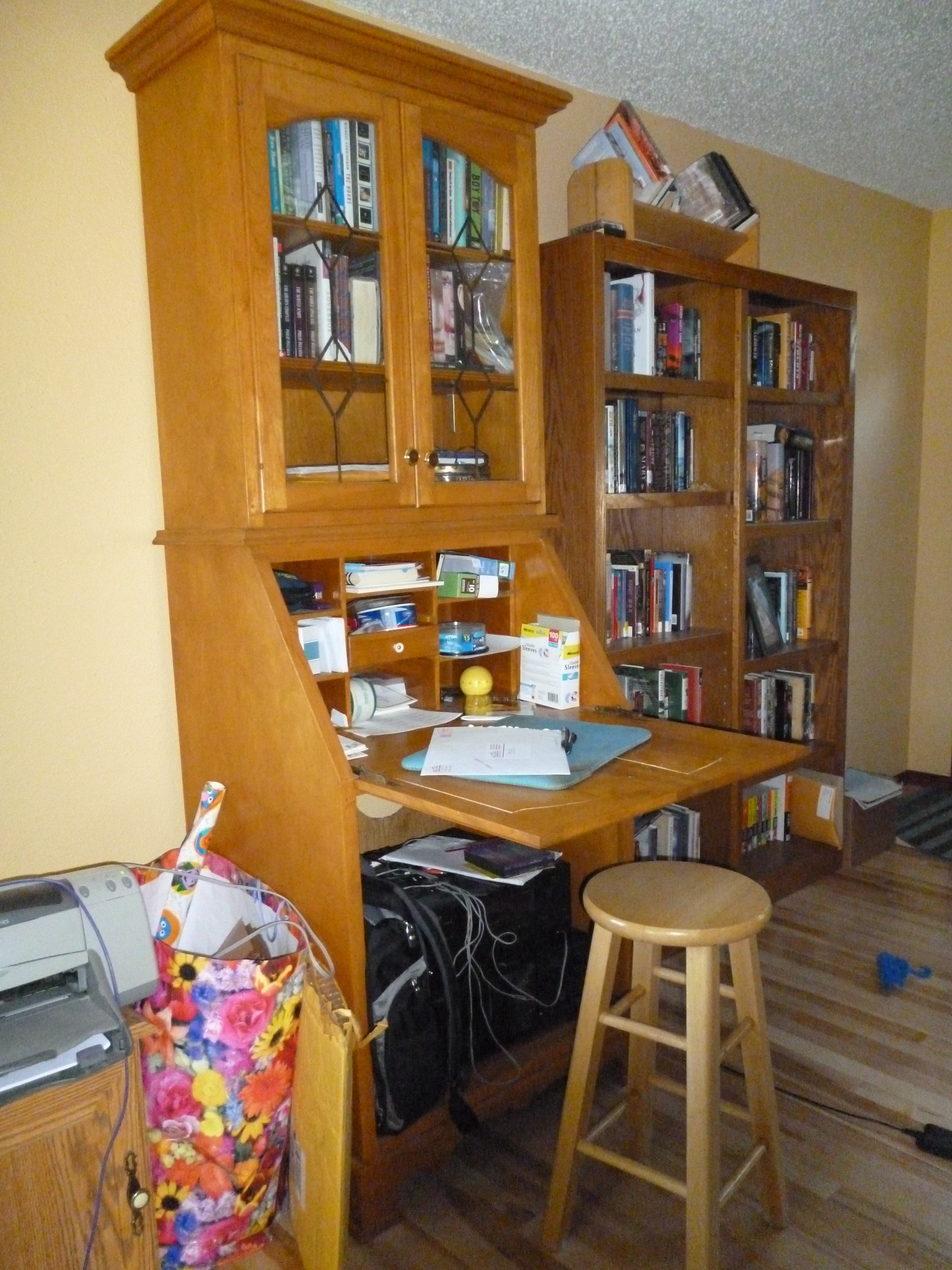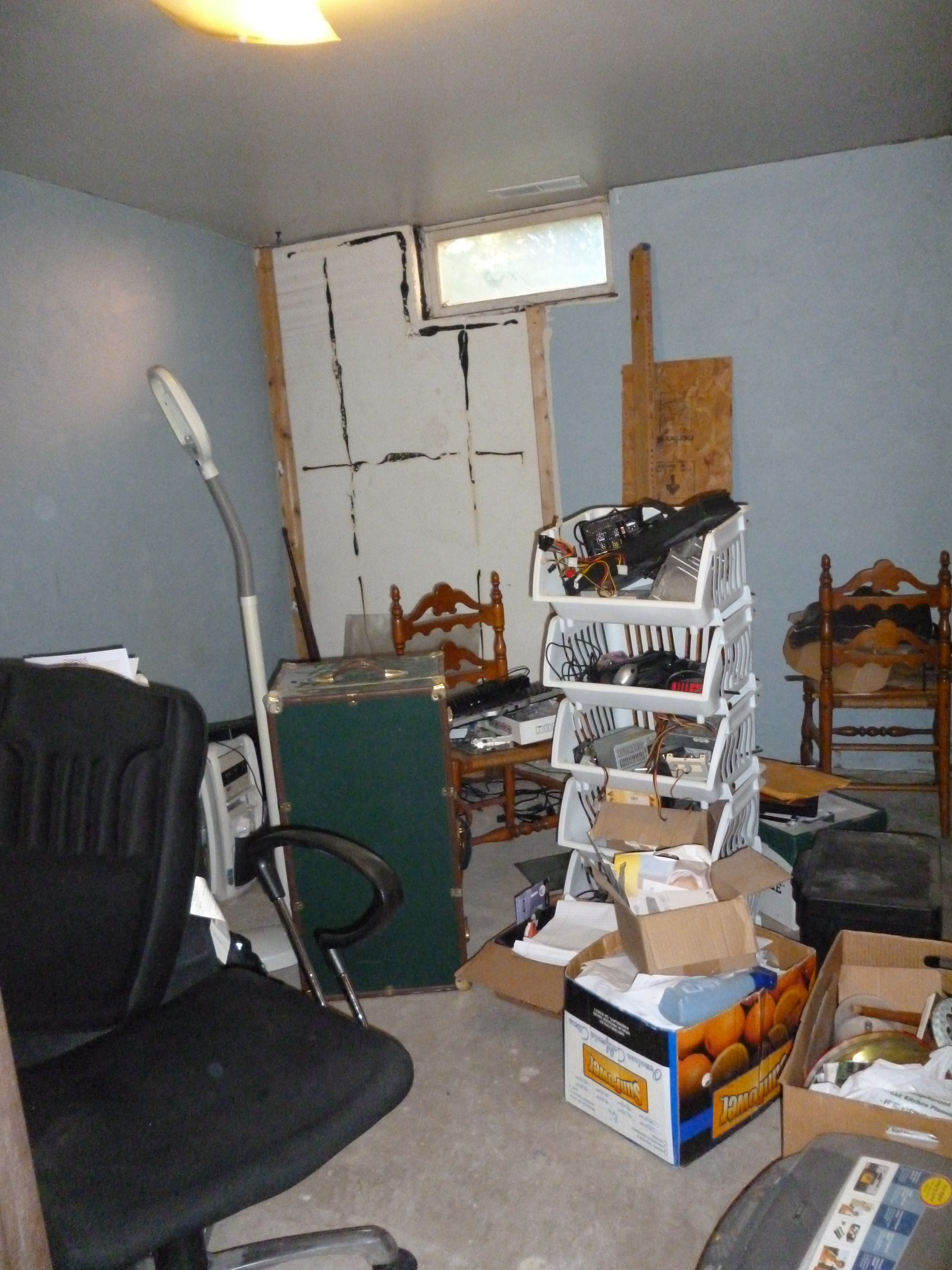 I was so excited to have received the check that I mused for a bit about being reluctant to cash it. That lasted for just a few minutes — until I decided that, rather than keep the check untainted, I’d rather put it toward furthering my success as a writer. So I’m putting it into a fund that will help pay for renovating my husband’s and my shared office. The first order of business will be an egress window because I don’t like working in dim spaces. The photo on the left reveals why this is necessary: